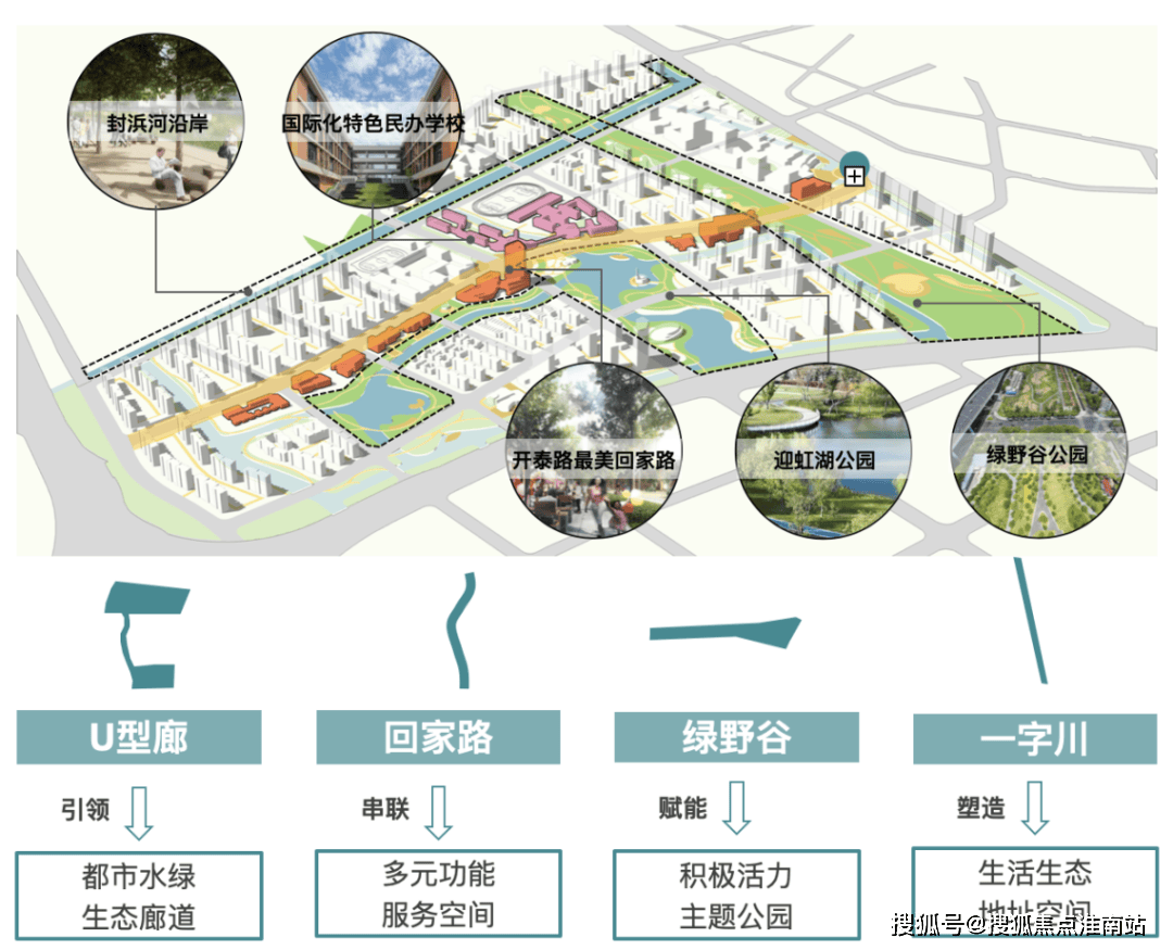 都会水绿生态廊道、多元功能办事空间、积极活力从题公园、糊口生态地址空间4大规划特征建立可持续成长的城市生态基底,如图所示。