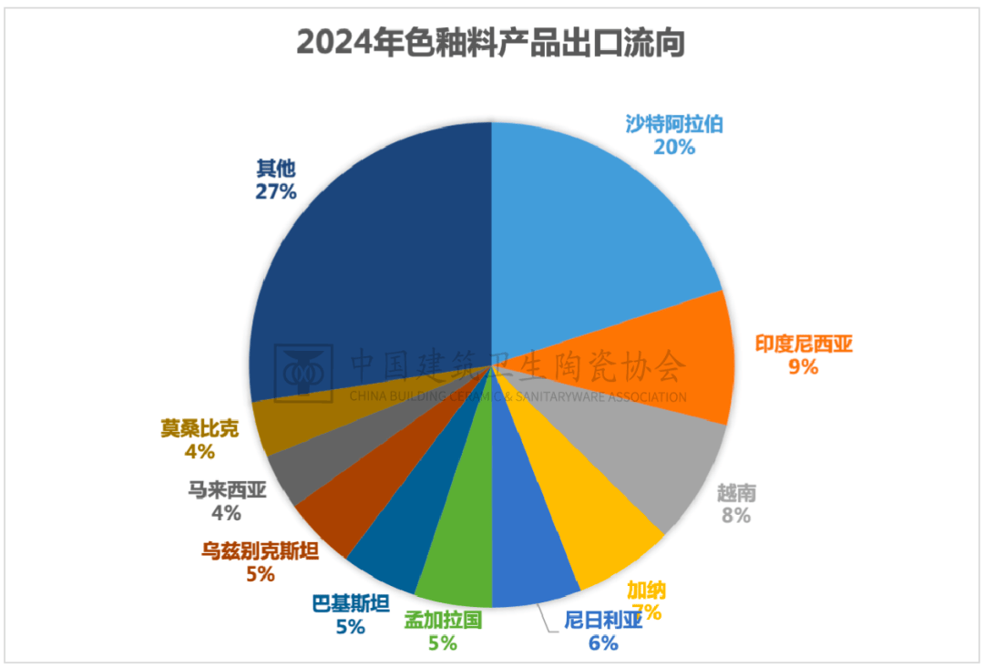 数据显示,色釉料出口高度集中于亚洲取非洲新兴市场,前十大出口国(沙特阿拉伯、印度尼西亚、越南、加纳、尼日利亚等)中,沙特阿拉伯以10。3万吨(占20%)位居第一,但单价最低(0。30美元/千克);越南、尼日利亚等市场单价较高(0。66-0。69美元/千克),反映区域需求分化。