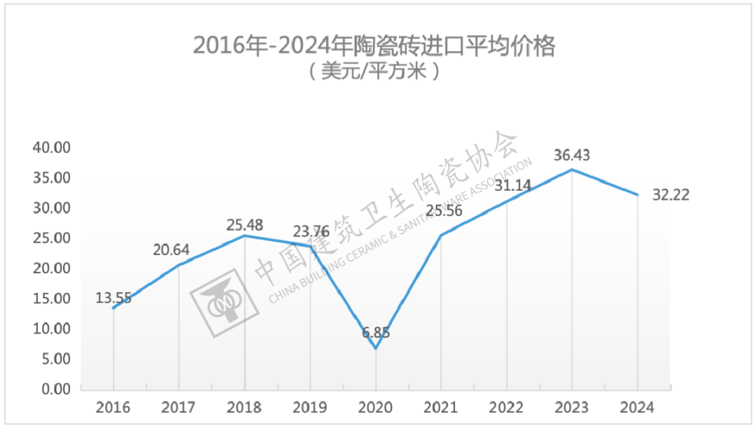2024年,陶瓷砖进口平均单价32。22美元/平方米,较2023年下降11。56%,仍处于近年的高位。