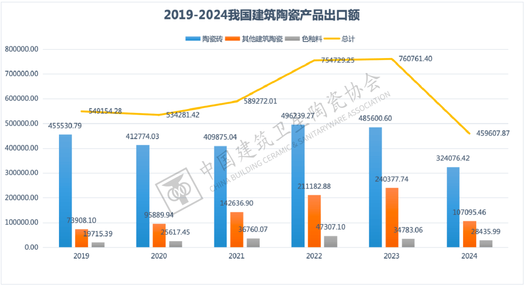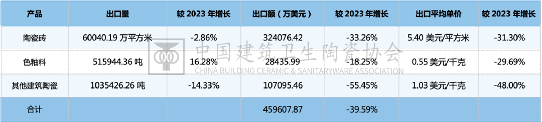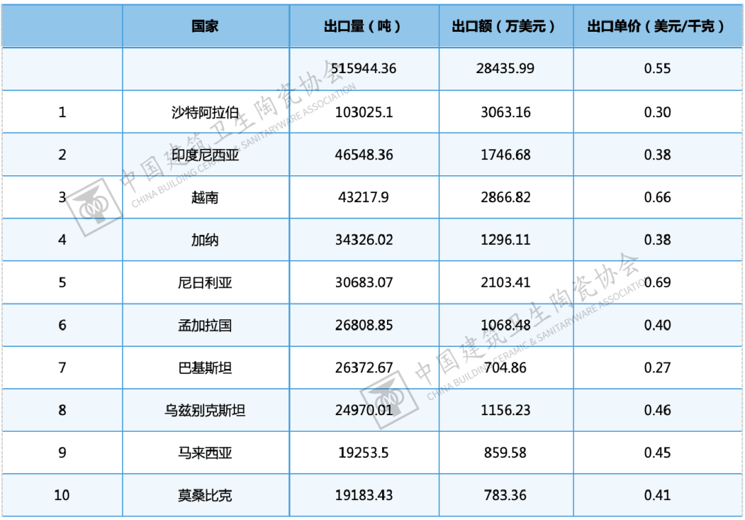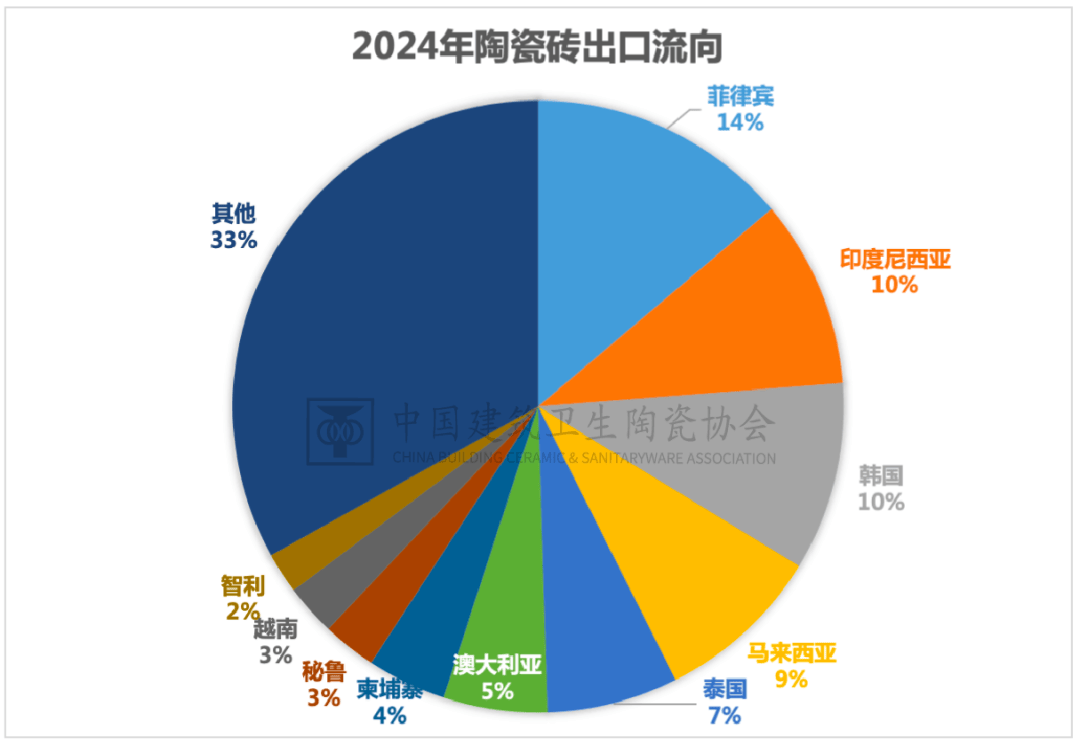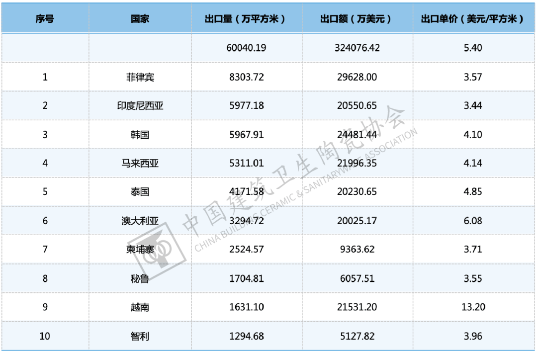 2024年,中国陶瓷砖出口前十大目标地国度/地域的出口总量为4。02亿平方米,占总出口量的66。92%,集中度较2023年提拔约2个百分点。