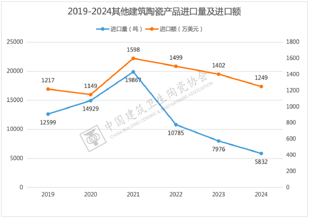 2024年,其他建建陶瓷进口量为5832。35吨,延续近年来下降趋向,同比降幅为26。88%,进口额为1249。09万美元,下降10。88%。