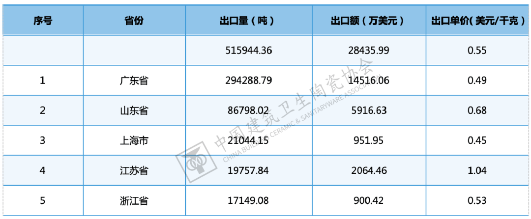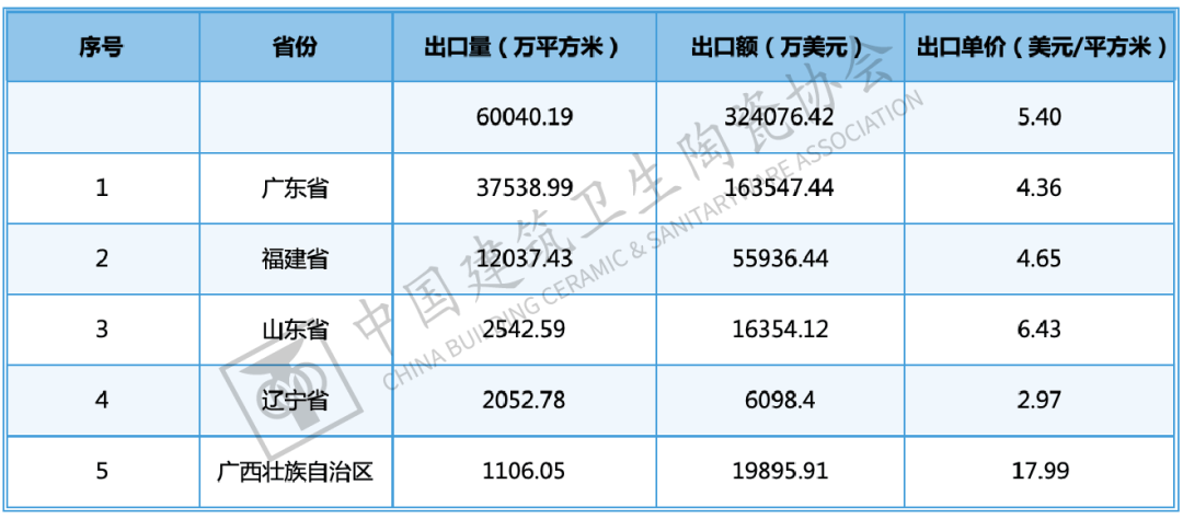 2024年,广东、福建、山东、辽宁、广西为我国陶瓷砖出口前五大省份,合计出口量占比达91。93%,取2023年(92。51%)根基持平。取2023年比拟,浙江跌出前五,广西上升至第5位。