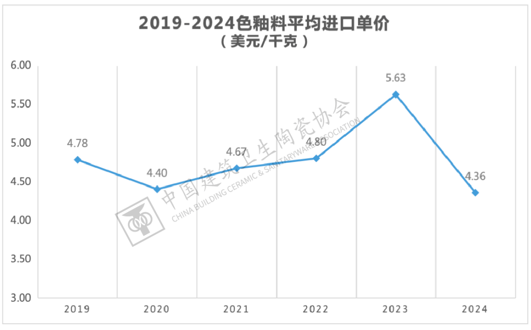 2024年色釉料产物进口平均单价下滑至4。36美元/千克,同比下降22。54%,为近年来新低。