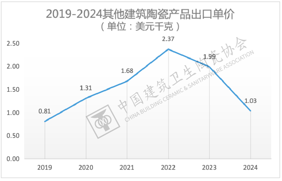 其他建建陶瓷产物出口单价正在2019年到2022年之间逐年攀升,正在2022年达到汗青高点后持续两年下滑,2024年,出口单价已下滑至2020年出息度。