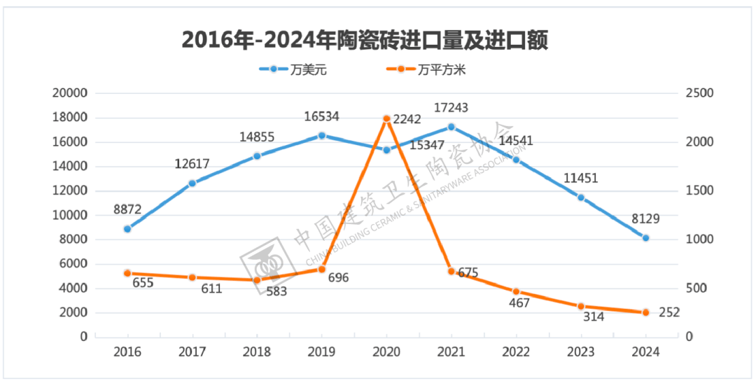 2024年,陶瓷砖进口商业延续量价双跌的趋向,进口量为252。31万平方米,同比下降19。73%,进口额为8129。08万美元,同比下降29。01%,进口规模进一步收缩。这一趋向次要是受国内房地产行业的影响,同时因为国内设想取制制程度提拔导致替代品增加,以及国际场面地步激发的物流和税收获本添加等要素配合感化的成果。
