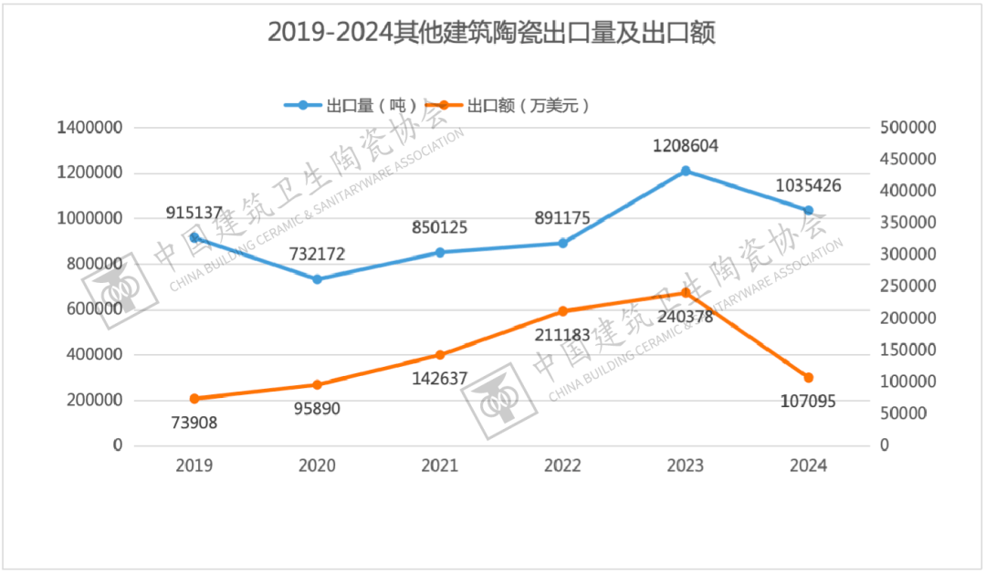 2024年,其他建建陶瓷出口量为103。54万吨,同比下降14。33%,出口平均单价为1。03,下降幅度为48。00%,量价双跌,受此影响,出口额降至10。71亿美元,接近腰斩(-55。45%)。