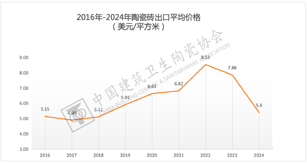 2024年,陶瓷砖出口单价为5。40美元/平方米,较2022年峰值(8。53美元/平方米)累计缩水36。7%,表白前期产物升级被阶段性逆转。一方面,东南亚、中东等新兴市场根本扶植需求为出口量的不变供给了支持,但中低端产物占比扩大导致价钱下探;另一方面,多国实施商业从义,倒逼企业降价保份额,出口高端化历程受阻。