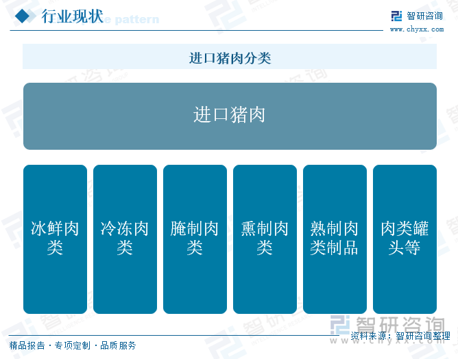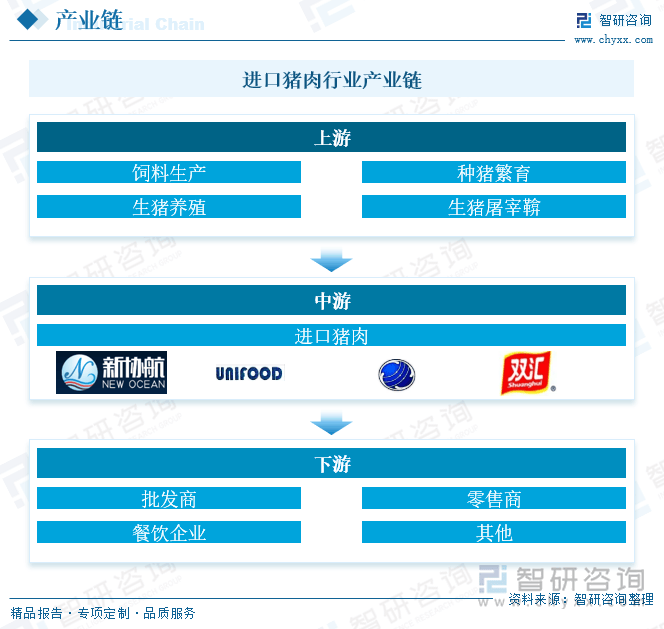 进口猪肉行业财产链上逛次要涉及饲料出产、种猪繁育、生猪养殖、生猪屠宰、粗加工、财产链中逛次要为进口猪肉环节。财产链下逛次要涉及国内分销零售。进口猪肉产物通过批发商、零售商及餐饮企业等渠道进入终端消费市场。这些渠道将进口猪肉产物发卖给消费者,满脚他们对高质量、多样化肉类产物的需求。