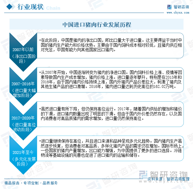 中国进口猪肉行业成长次要履历了四个阶段。2007年以前的净出口国阶段,正在此阶段,中国是猪肉的净出口国,即出口量大于进口量。此次要得益于其时中国的猪肉出产能力和价钱劣势。次要因为国内饲料成底细对较低,且猪肉供应相对充脚,中国有能力向其他国度出口猪肉。